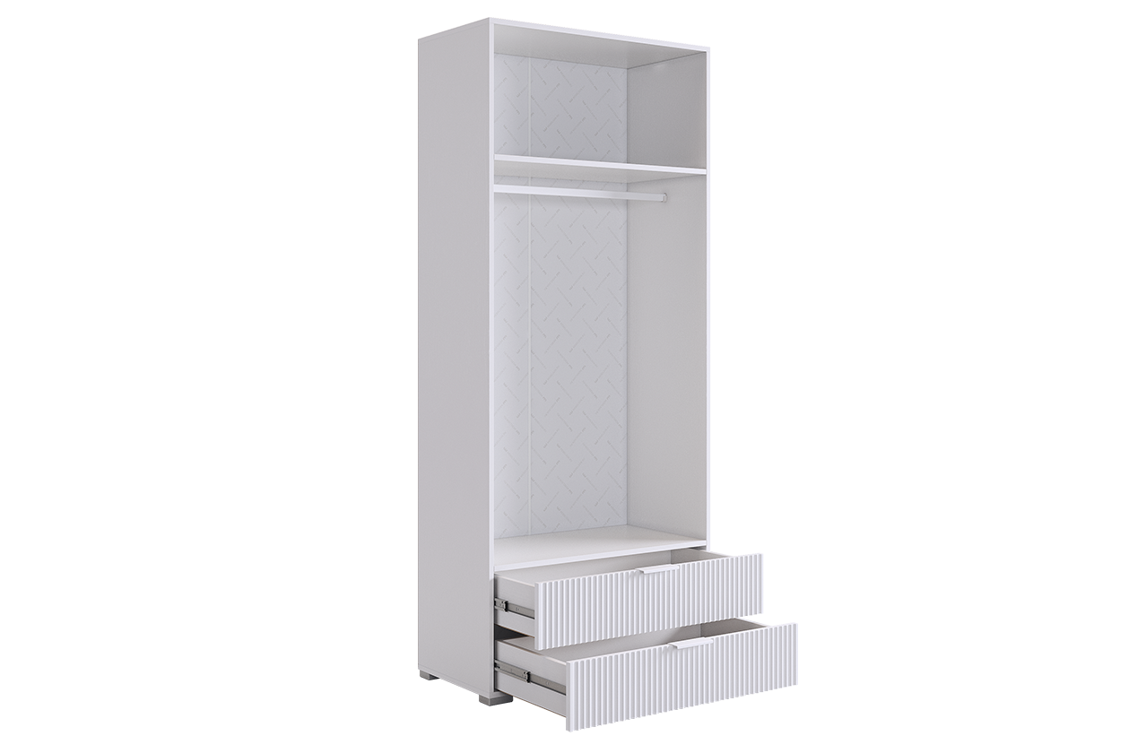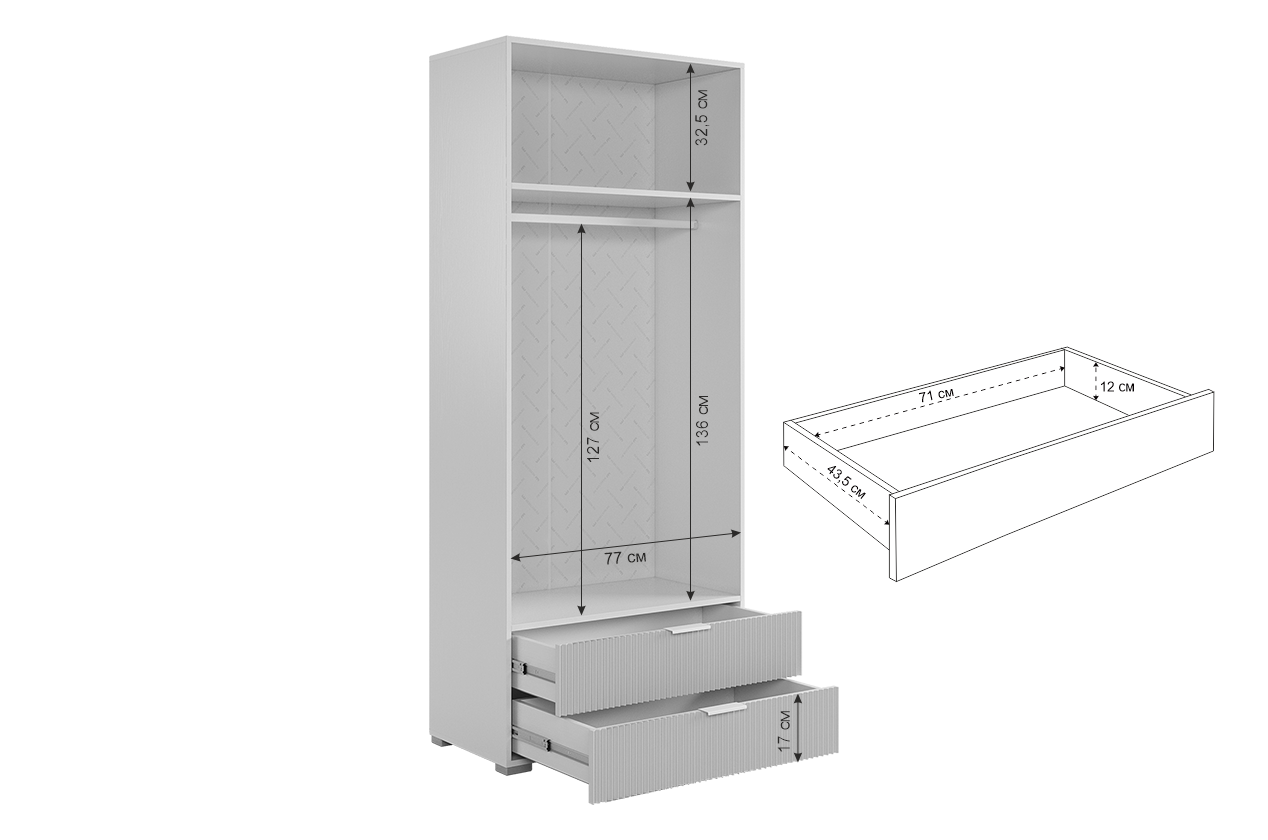 - Внутри шкафа вы найдете штангу для одежды, полки.А также два удобных ящика с шариковыми направляющими.