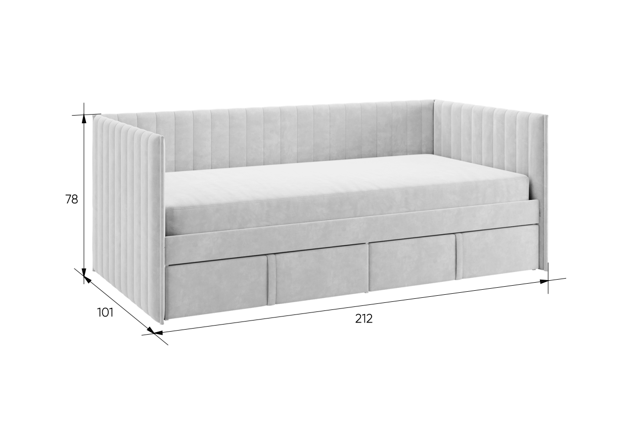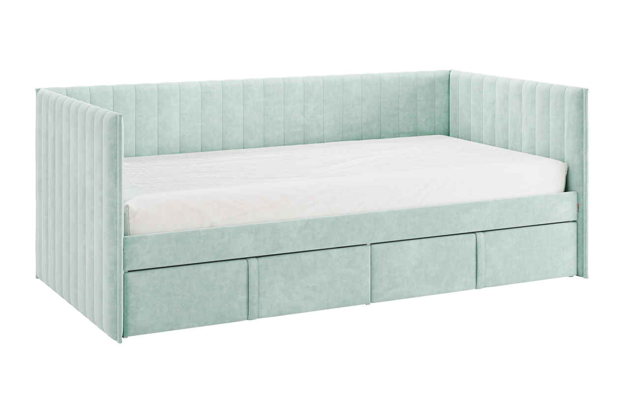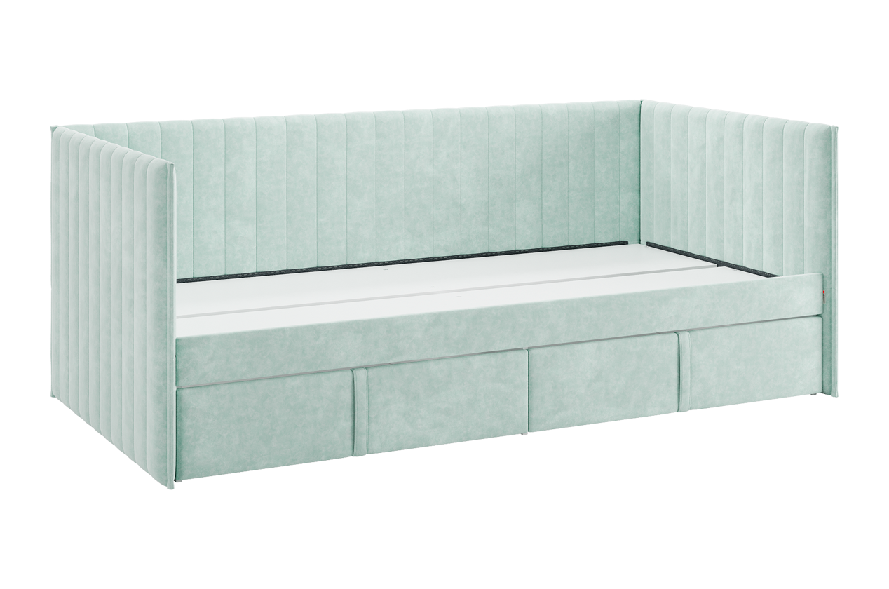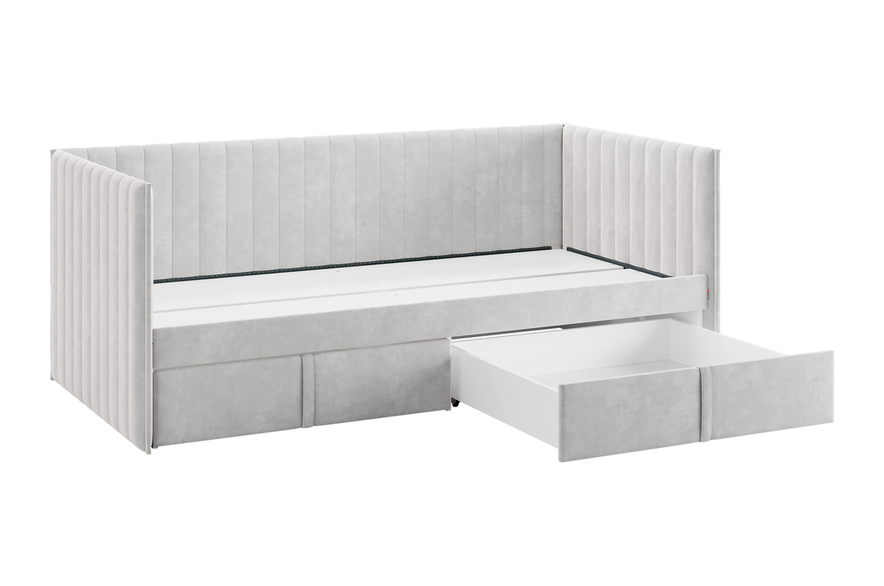 Кровать с ящиками Твикс, корпус изголовье и задняя боковина выполнены из прочного ДСП толщиной 16 мм, ППУ и велюра, что обеспечивает долговечность и надежность конструкции. Мягкие фасады выкатных ящиков, обтянутые благородной велюровой тканью, добавляют элемент роскоши и создают уютную атмосферу в комнате.