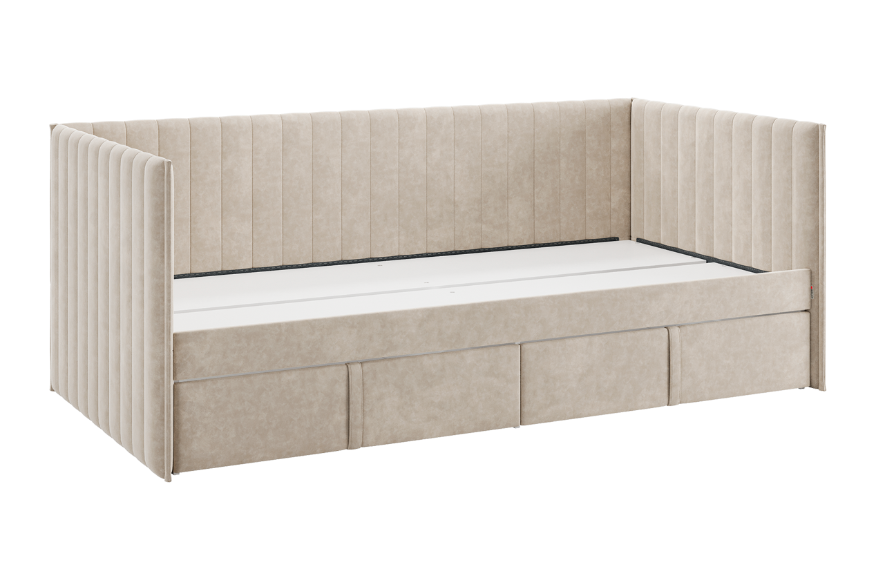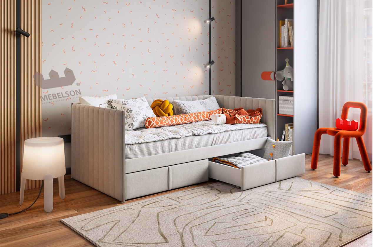 Вместительные выкатные ящики предоставляют дополнительные возможности для хранения постельного белья, одежды или других важных вещей, что особенно актуально для небольших помещений. Настил из ЛДСП гарантирует удобство и надежность использования.