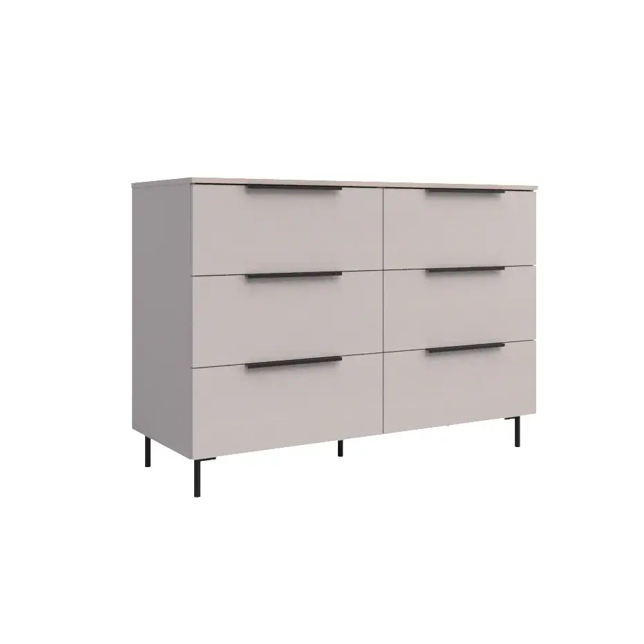 Комод имеет шесть выдвижных ящиков, которые обеспечивают достаточно места для хранения различных вещей. Фасады ящиков выполнены из МДФ, что обеспечивает прочность и долговечность. Фурнитура скрытого монтажа с доводчиками гарантирует плавное закрывание ящиков, что предотвращает повреждение фурнитуры и сохраняет их внешний вид на долгое время. Металлические ножки высотой 12 см. в количестве пяти штук обеспечивают равномерную нагрузку на поверхность пола и дополнительную устойчивость.