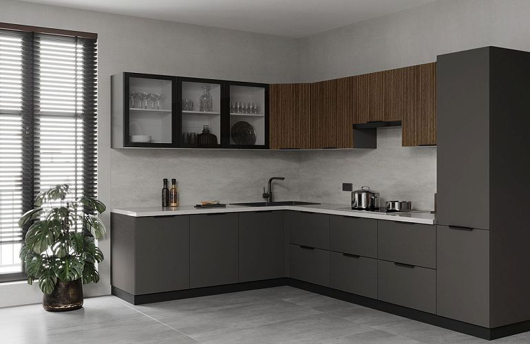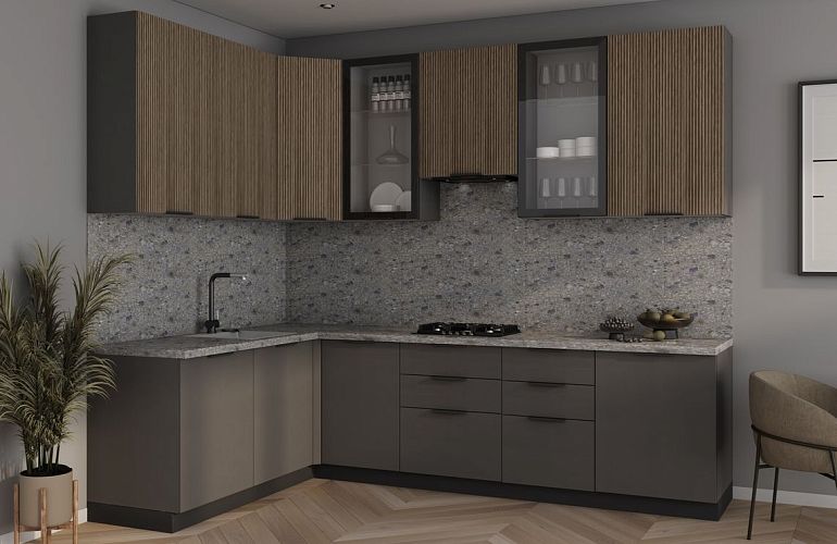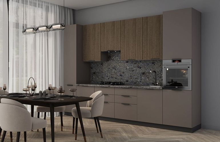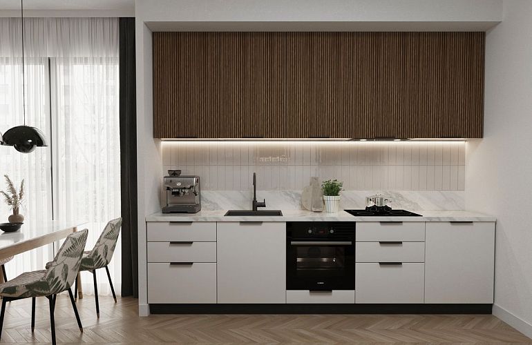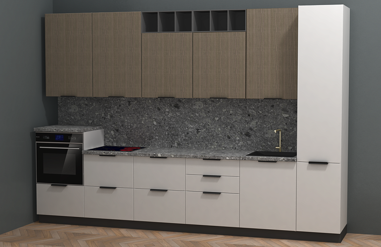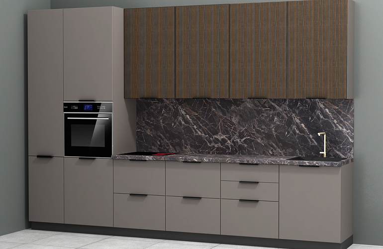 Деревянная рейка – это тренд, который лег в основу создания данной кухни. Главной особенностью является декор верхних фасадов – это пленка с деликатной реечной фактурой натурального, древесного оттенка, которая имеет 3d эффект, и добавит нотку актуальности в интерьере, при этом, не создавая лишний визуальный шум. Использование такого декора позволяет отказаться от использование рельефных фрезеровок, что в дальнейшем облегчает уход за изделием. Также можно комбинировать фасады в пленке с фасадами из стекла в черном обрамлении.
