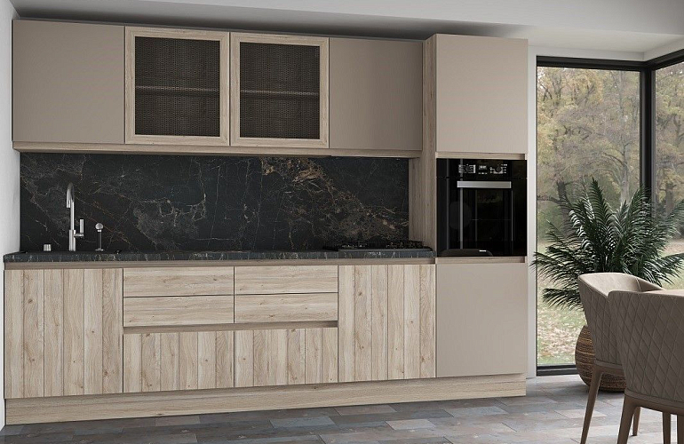Кухонный гарнитур Оттава выполнен в минималистичном скандинавском стиле с использованием нейтральных бежевых оттенков. В качестве акцента применена имитация амбарной доски. Такой гарнитур подойдет и для маленькой кухни в “хрущевке”, и для квартиры-студии. Простая и функциональная мебель, а выглядит при этом стильно и уютно.