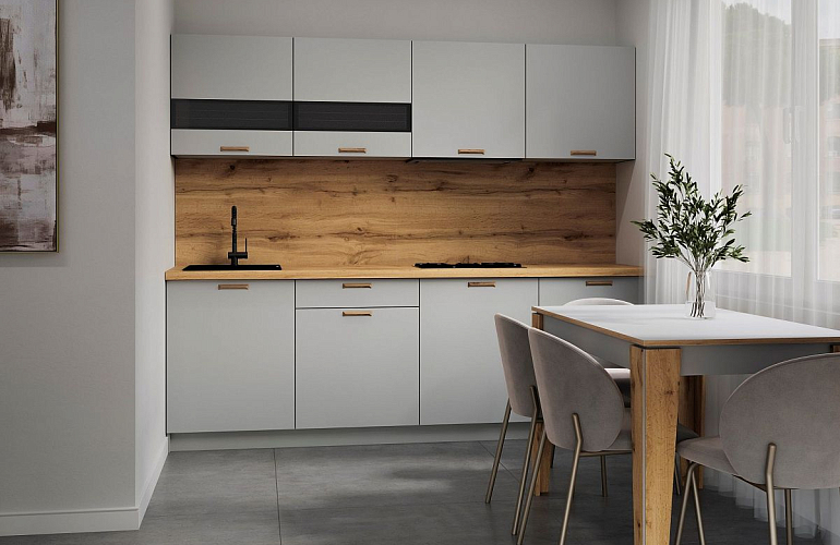 Кухонный гарнитур «Смарт» представляет собой конструкцию из интегральных блоков различной длины. Вытяжка устанавливается в отдельный блок. Основание и лицевая часть выполнены из ДСП толщиной 16 мм в светло-серых тонах. Кромка лицевых элементов выполнена из ПВХ под дерево. Рабочая поверхность имеет толщину 26 мм и оформлена под дерево. Для ручек используется пластик, имитирующий деревянную текстуру, гармонирующий с поверхностью стола. Стеклянные элементы фасада декорированы методом шелкографии в черном цвете. Дверцы оснащены петлями с механизмом плавного закрывания.
