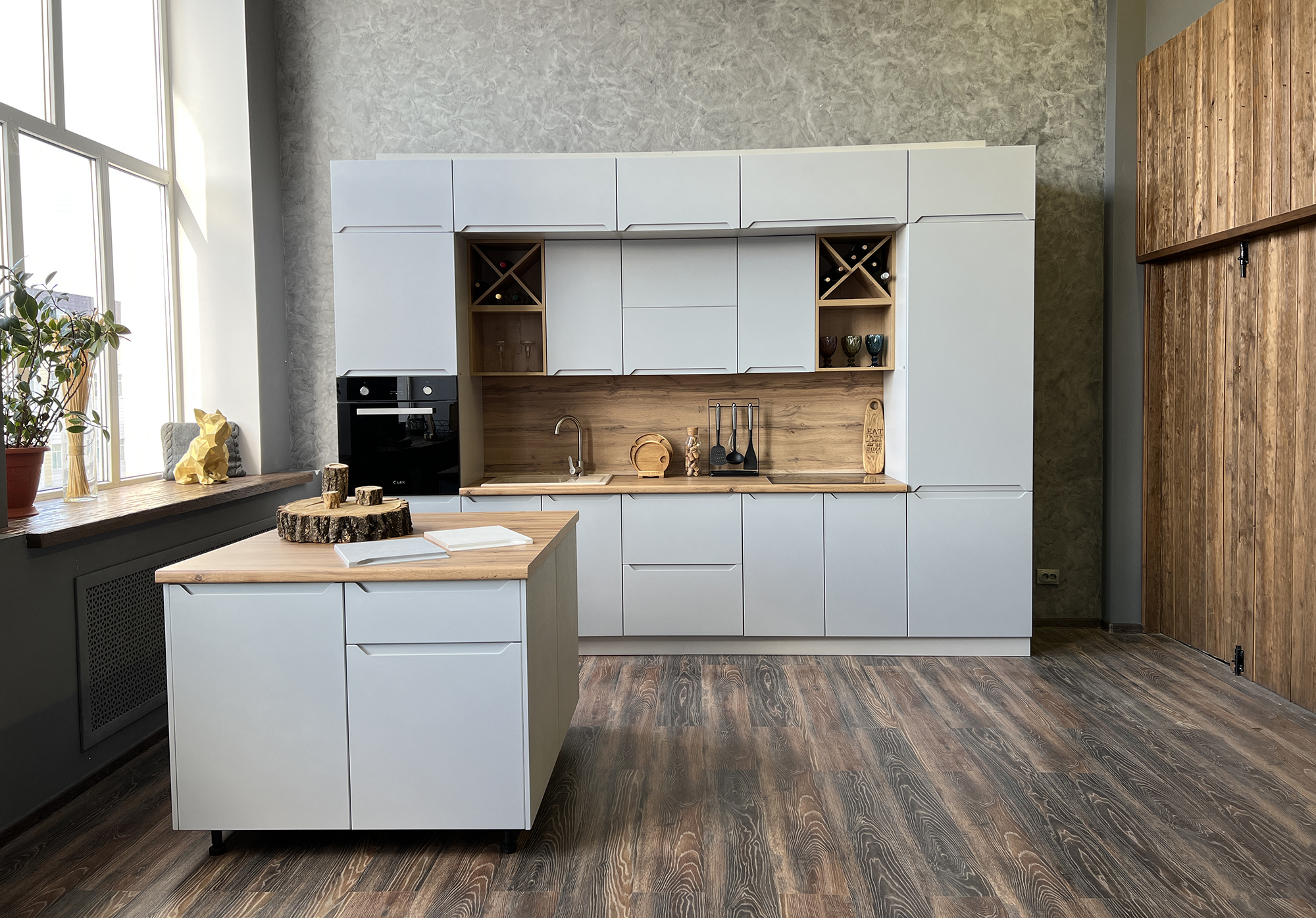 Кухонный гарнитур отличается точной мастерской работой и вниманием к деталям. Главный акцент, полюбившиеся всем – интегрированные ручки.