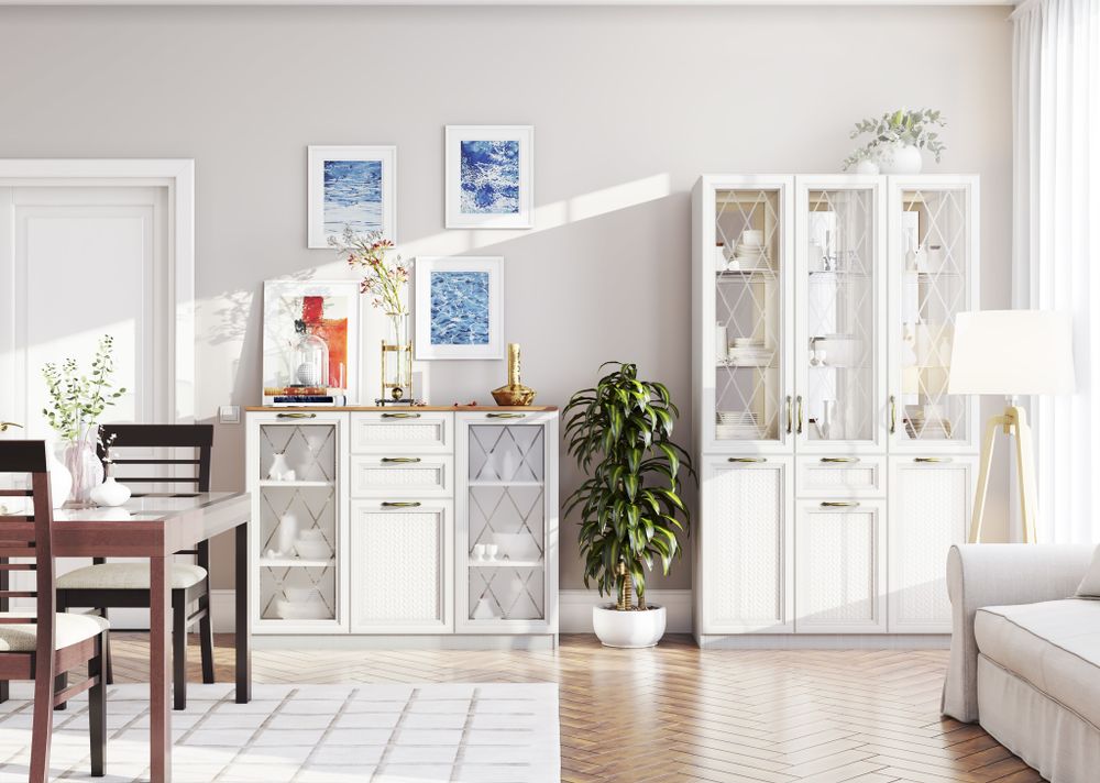 Каркас гостиной изготовлен из ЛДСП толщиной 16 мм - современного недорогого и практичного материала. Фасады деталей - рельефный профиль и накладка МДФ с 3D-узором "Плетенка".