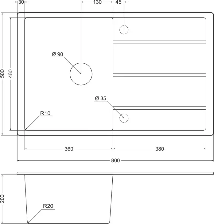 Форма у мойки - прямоугольная, тип исполнения мойки: одна чаша с крылом.