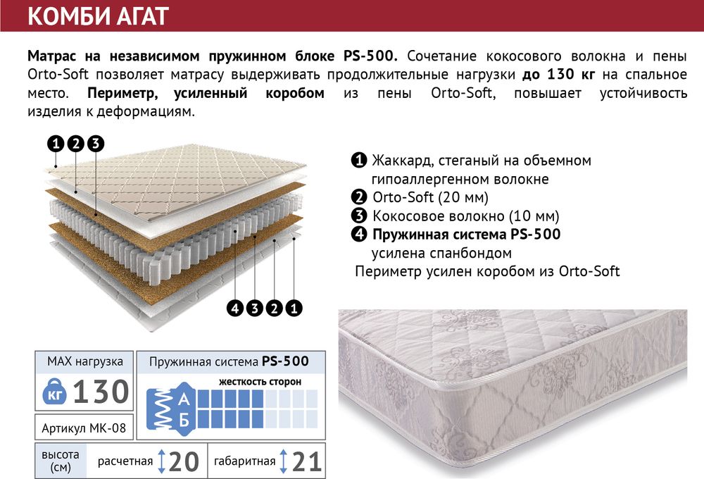 Ортопедический матрас "Комби Агат ПС500" от Мелодии сна - идеальный выбор для здорового и комфортного сна. Высокая жесткость, благодаря блоку независимых пружин, обеспечивает оптимальную поддержку позвоночнику. Наполнение из Orto-Soft, би-кокоса и спанбонда делает поверхность упругой и приятной на ощупь. Долговечность материалов гарантирует длительный срок службы продукта.