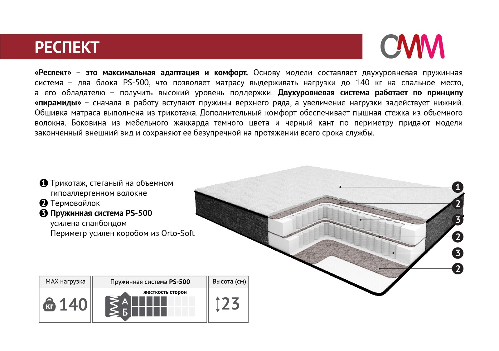 Основу модели составляет двухуровневая пружинная система — два блока PS-500, пружины в которых поджаты до высоты 10 см, что принципиально меняет упругость матраса. Благодаря новой конструкции и технологическим решениям классическое наполнение из пены Orto-Soft и термовойлока ощущается абсолютно по-другому — при «слепом» тестировании по уровню жесткости и поддержки участники отмечали, что в составе матраса есть кокосовое волокно. Данный матрас рекомендуем партнерам заказать именно в полноразмерном виде, чтобы убедиться в новых свойствах. Матрас рассчитан на нагрузку до 160 кг, его габаритная высота 25 см. Для удобства транспортировки модель может быть заказана в сжатке — новая боковина из мебельного жаккарда практически не мнется и возвращается в первоначальный вид через несколько часов после снятия упаковки «сжатка».