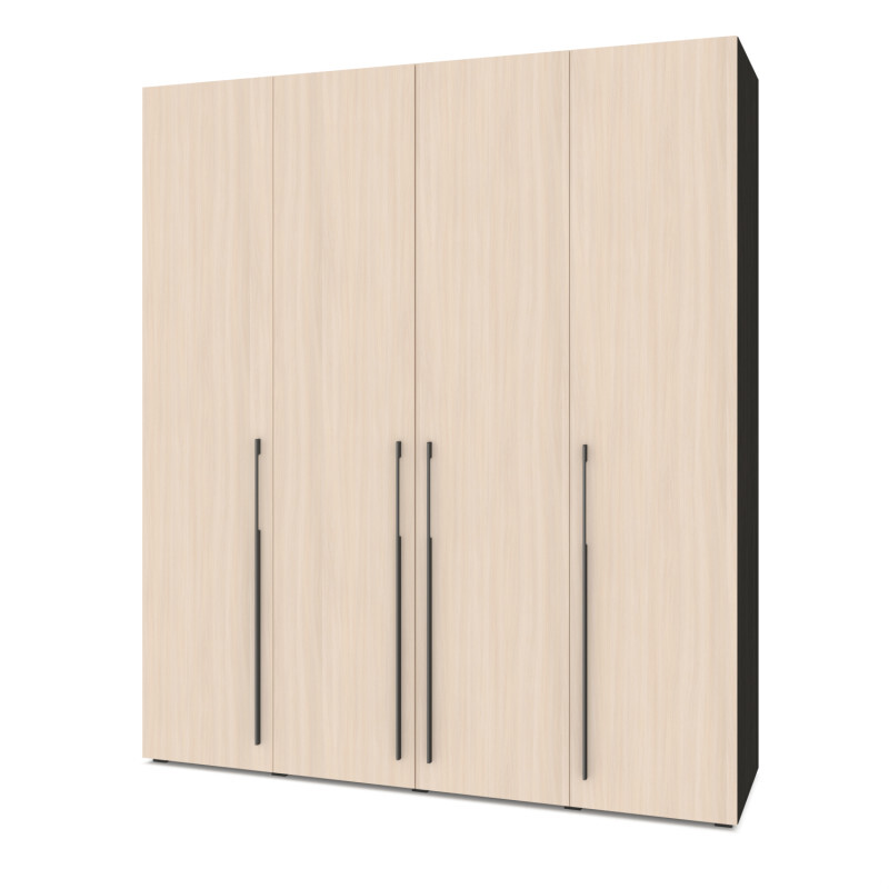 Шкаф выполнен из высококачественного ЛДСП и имеет размеры: ширина 200см, глубина 56см, высота 230см. Четыре длинные стильные металлические ручки длиной 100см добавляют шкафу современный и элегантный вид. Распашные двери закрываются плавно благодаря петлям с доводчиком, что предотвращает их громкое хлопанье.