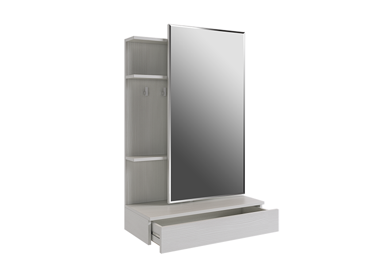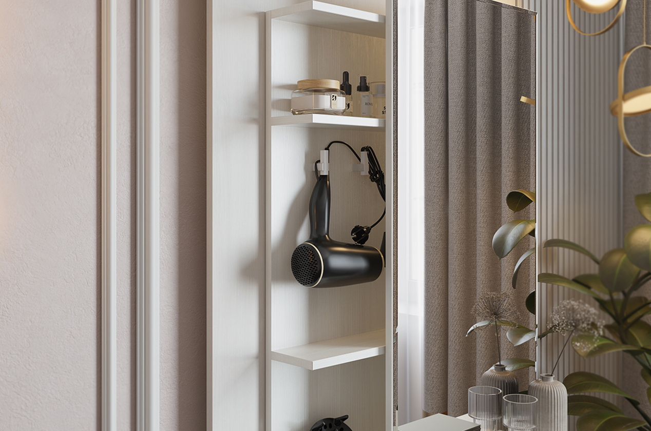 Трюмо Арина можно повесить на любой удобной высоте. Зеркало легко отодвигается в сторону, открывая доступ к дополнительным полкам и крючкам. На них удобно разместить баночки с кремами, косметику, аксессуары и фен для волос. Небольшой выдвижной ящик позволит держать важные мелочи под рукой, но не на виду.