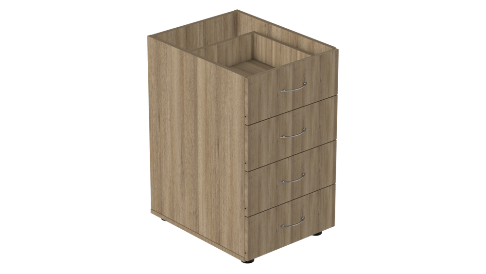 Модель тумбы приставной Р.Т-4.3 размером 430х542х728мм выполнена с системой хранения документации в четырех выдвижных ящиках и предполагает стационарное расположение под стол глубиной не менее 680 мм.