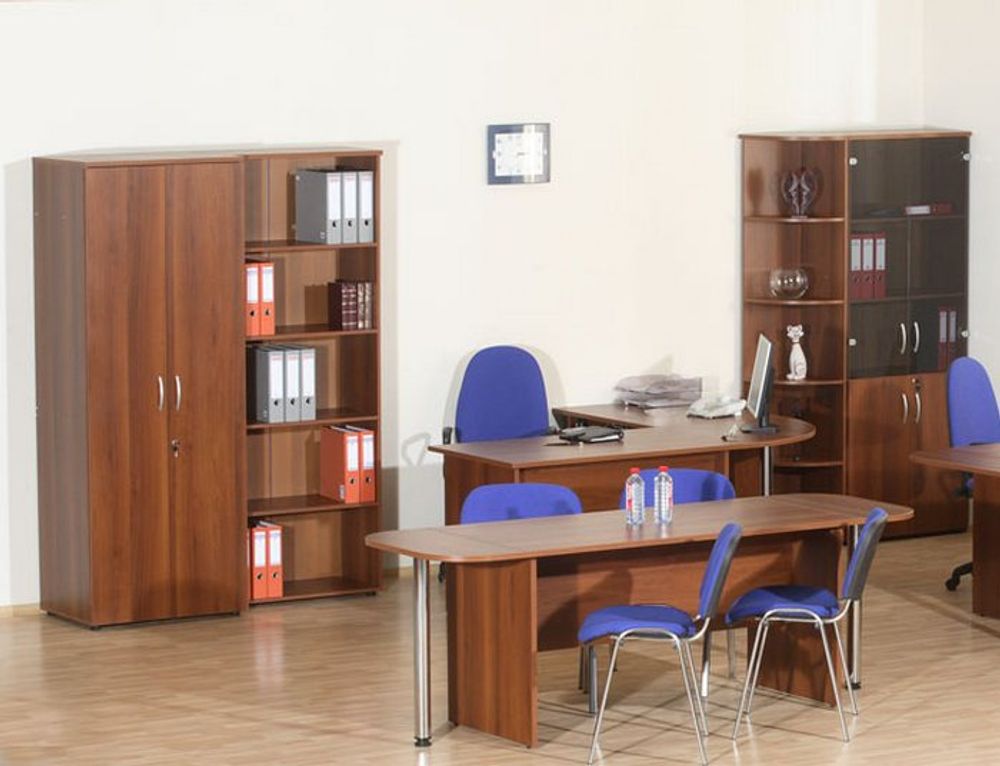 Корпуса и двери изготовлены из ЛДСП 16 мм с применением канта ПВХ 0,4 мм (корпуса). Столы и верхняя крышка шкафов изготовлены из ЛДСП 22 мм и канта ПВХ 2 мм.